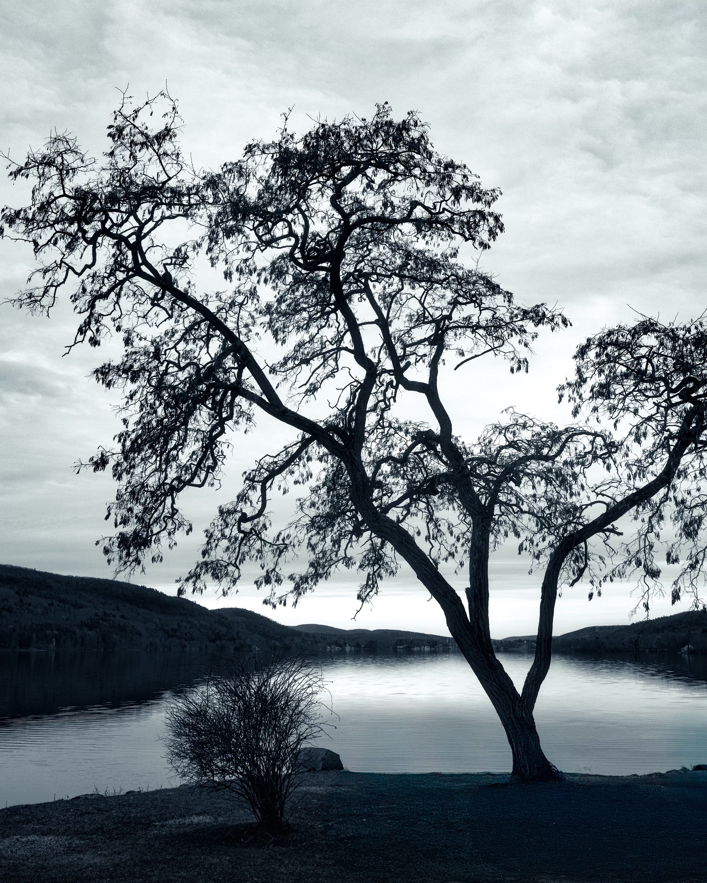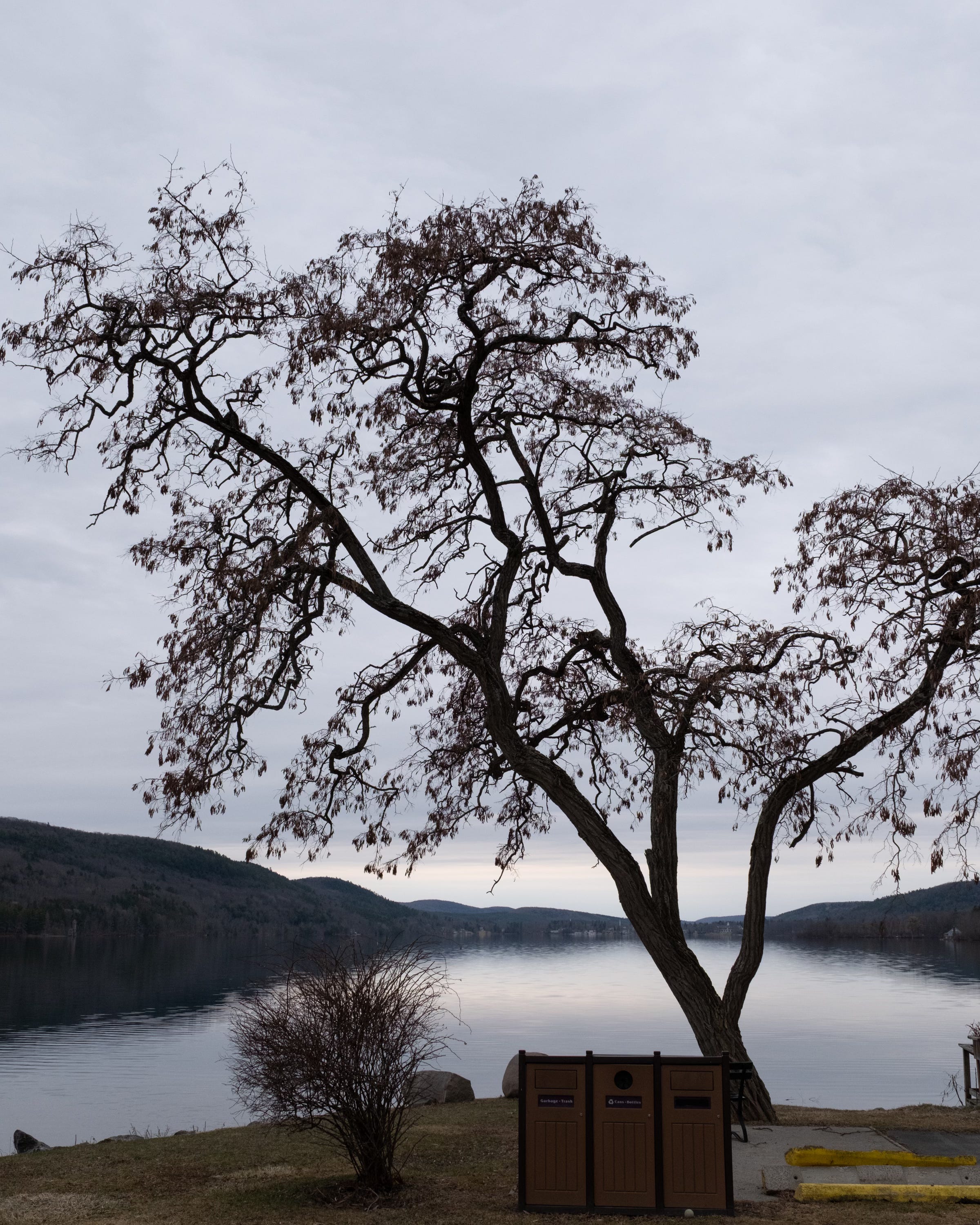 I chose this composition knowing there were distractions—a row of trash bins and some pavement—but this was the framing that felt right. I tried other angles to avoid the extra items, but the way the trunk split and opened toward the lake made this the image I wanted. I removed the bins in Photoshop as a last resort—not to fake the scene, but to let the scene I saw come through more clearly.